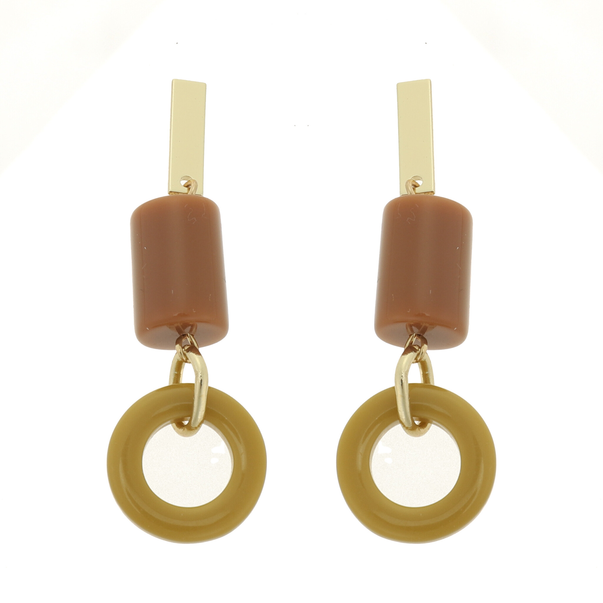Deze kaki camel oorbellen zijn in goudkleur afgewerkt en zijn 5.5 cm lang De disc onderaan de oorbel heeft een diameter van 1.7 cm ongeveer