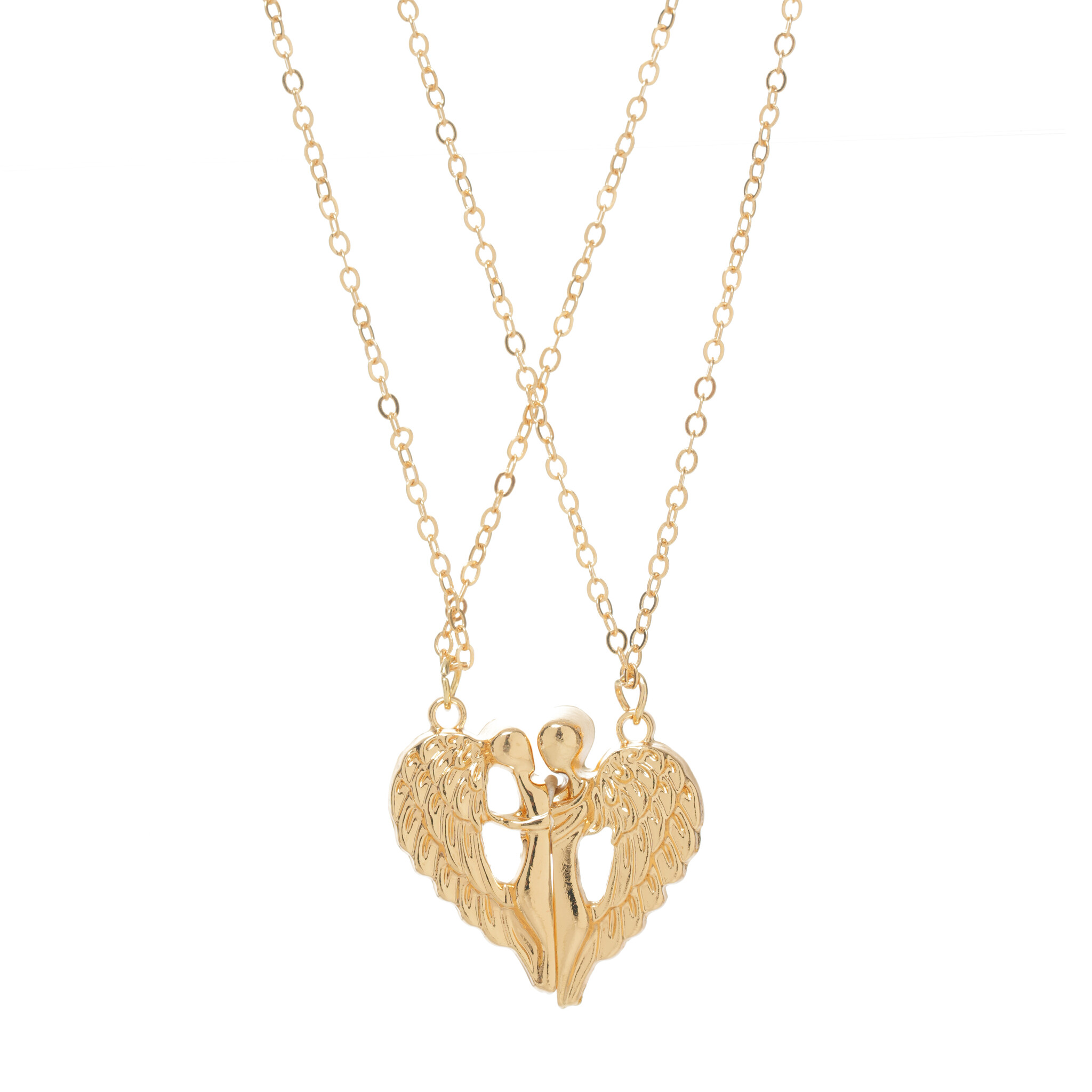 Goudkleurige Angel Wings kinderhalskettingenset bestaande uit 2 halskettingen met verbonden engeltjes die als beschermende symboliek gedeeld kunnen worden De engeltjes pendants zijn 3 cm hoog en hebben geen magneten&vormen een hart&hebben verlengketting