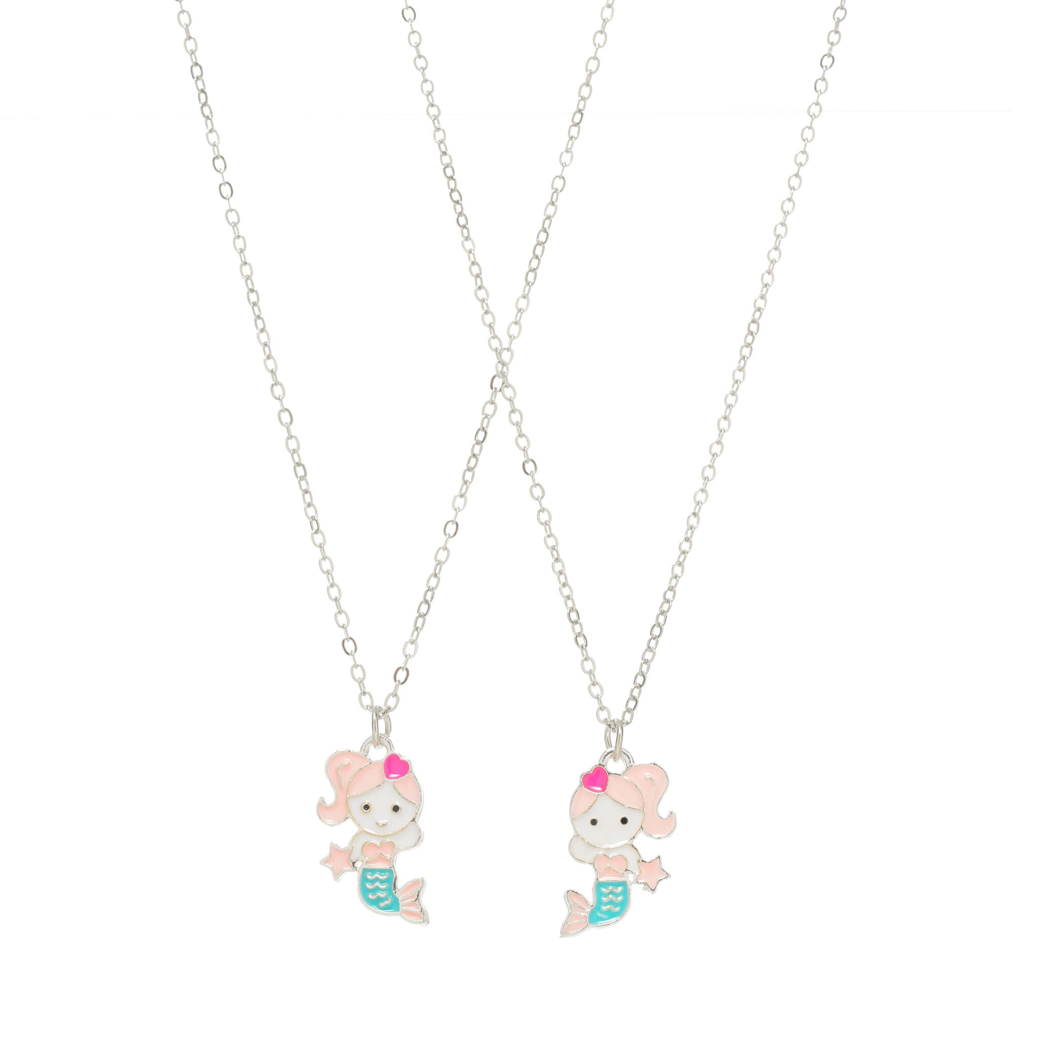 Zilverkleurige Mermaid kinderhalskettingenset bestaande uit 2 halskettingen met 2 zeermeerminnen die gedeeld kunnen worden De zeemeerminnen pendants zijn 2 cm hoog en hebben geen magneten en hebben verlengketting