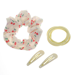Cherry scrunchie met 5 soft gele elastiekjes en een paar soft gele click clack set