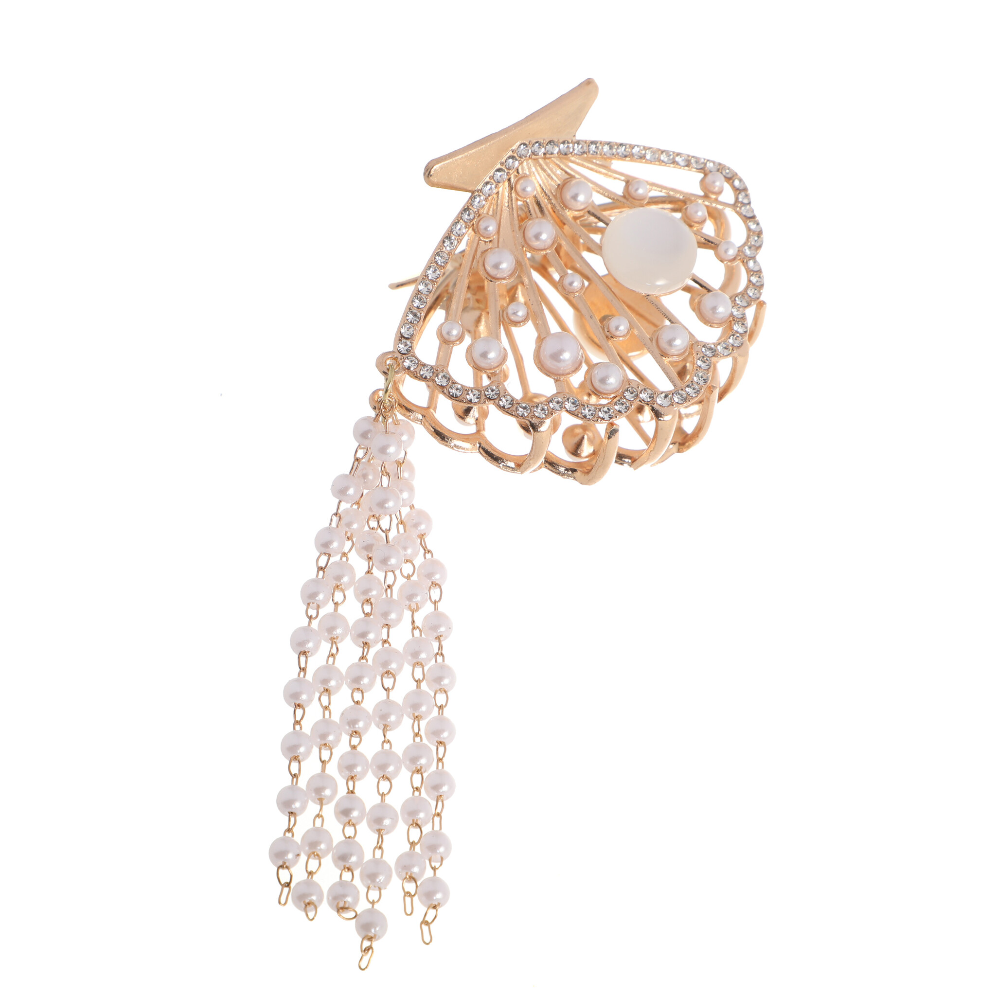 Goudkleurige Shell haarklem met parels en crystals op de schelp aangebracht De schelp heeft parelkettingkjes aan het uiteinde van de klem De breedte van de klem is 5,5 cm x 4 cm