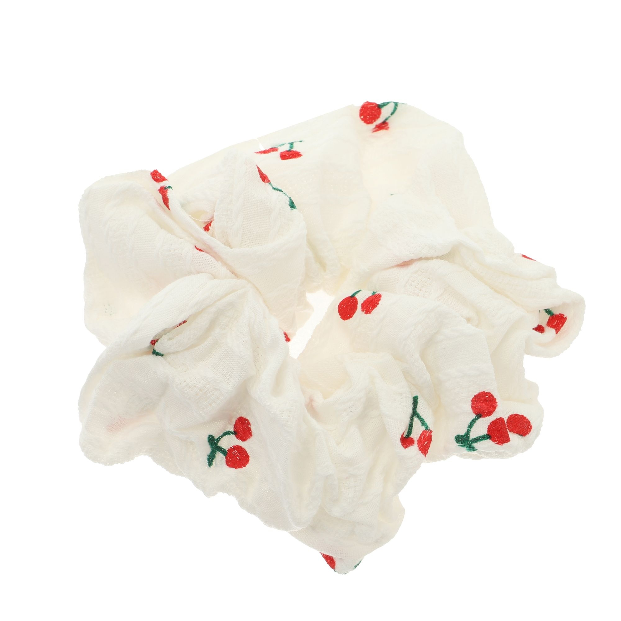 Deze Cherry scrunchee met kersjes is gemaakt van een wit stofje en heeft relief in het stof