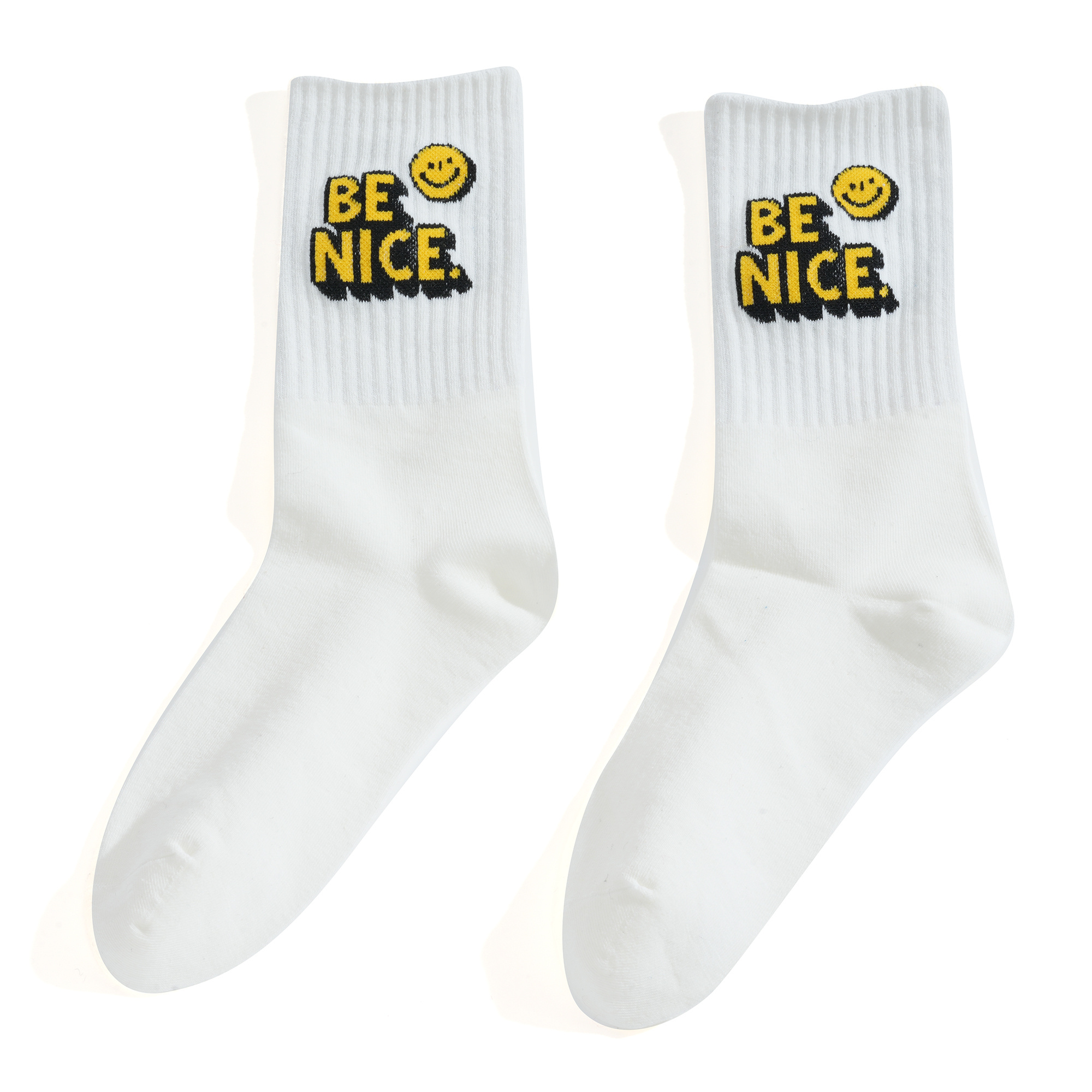 Witte sokken 'be nice' met geel smiley design - 67,2% cotton 29,9% polystester 2,9% spandex. Maat 36-41