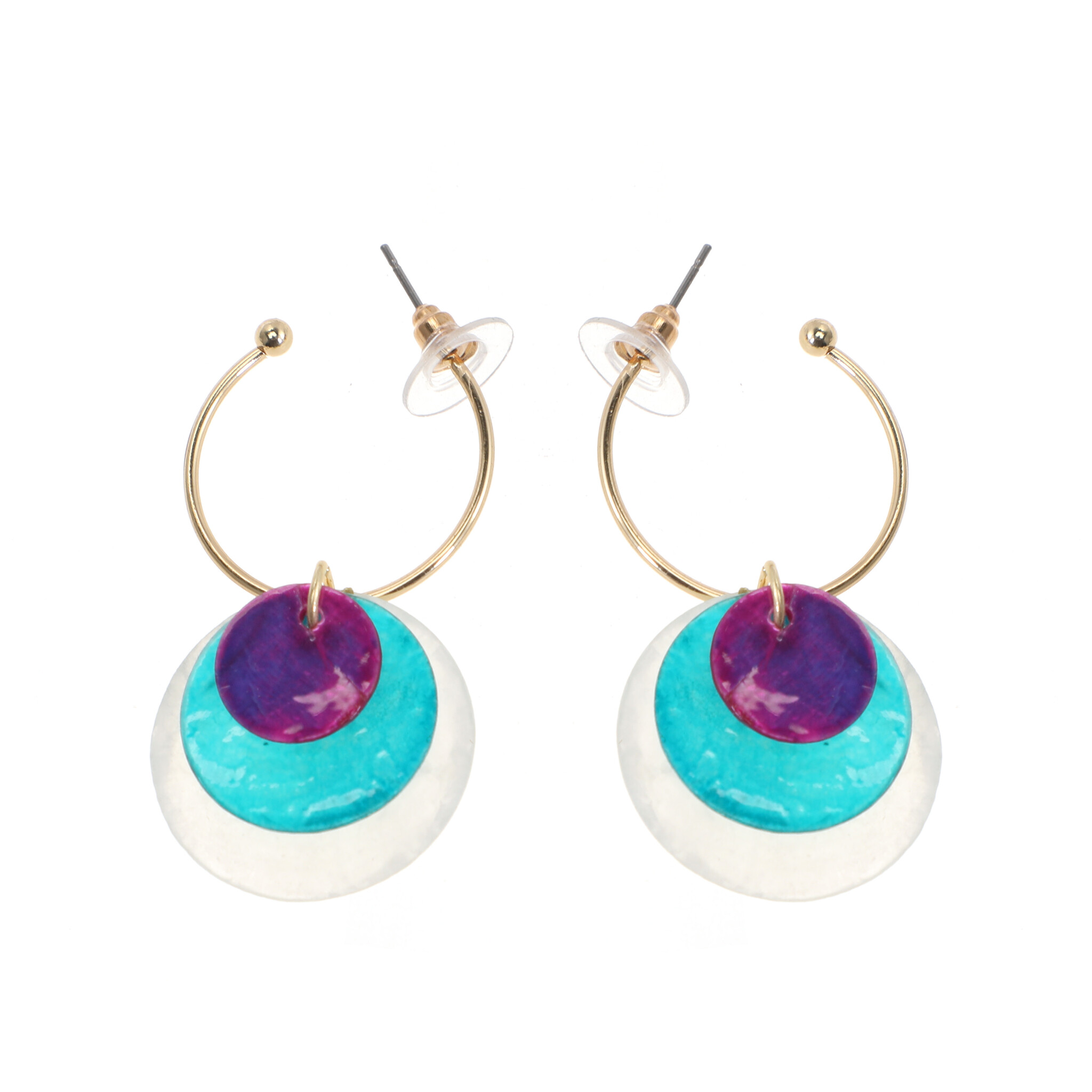 Goudkleurige creool van 2.3 cm diameter met 3 kleurrijke tropische schelpjes Diameter van grootste witte schelpje is 2.5 cm