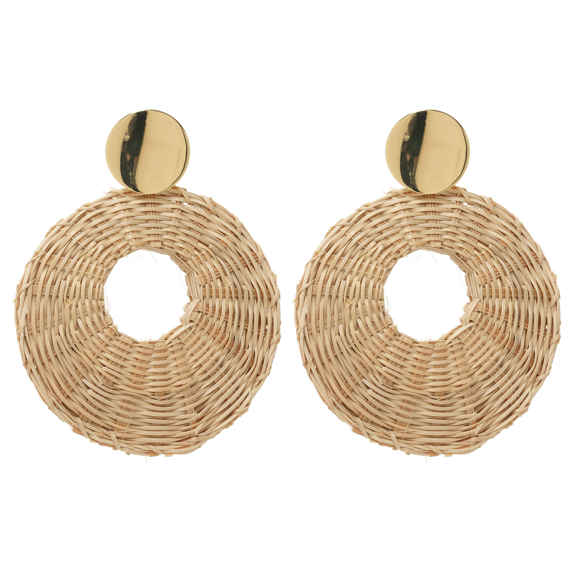 Rieten oorbellen met de hand geweven in naturel kleur, de rieten discus van deze statement oorbellen heeft een diameter van 6cm en de totale lengte van de oorbel is 8 cm
