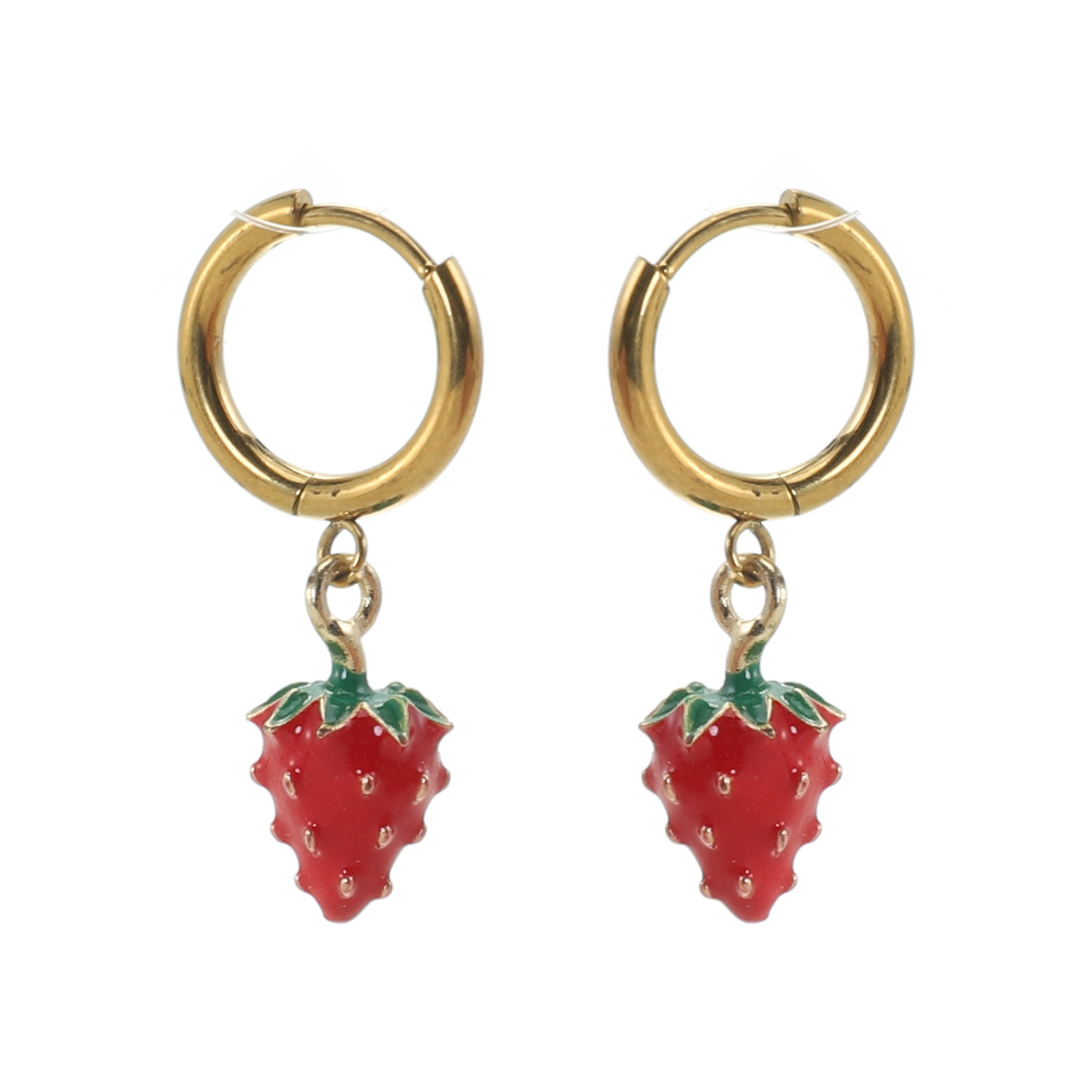 Strawberry oorbellensetje met mini aardbeien charms van maar iets meer dan 1 cm groot zijn gemaakt uit stainless steel en met een echt gouden laagje afgewerkt ♥ De totale lengte van de oorbellen is 3 cm
