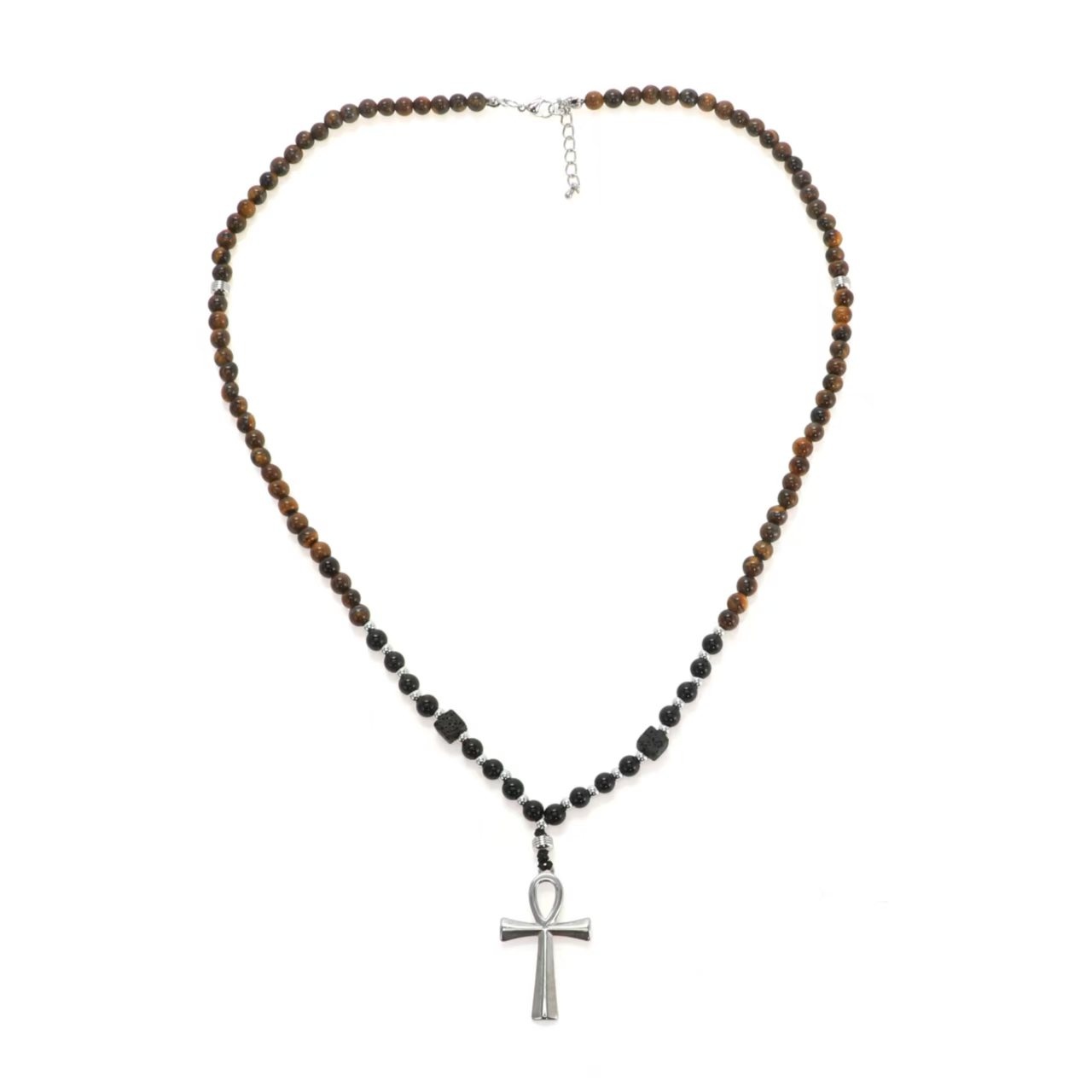 THE ANKH necklace bestaat uit stainless steel, Tiger, Lava en Agate stones en is de key of eternal life.Lengte van halsketting is 33 cm.Ankh is 4,5 cm.Standaard verpakt in Oosters stoffen zakje. De geschenkverpakking kan je extra bijbestellen (item T00018