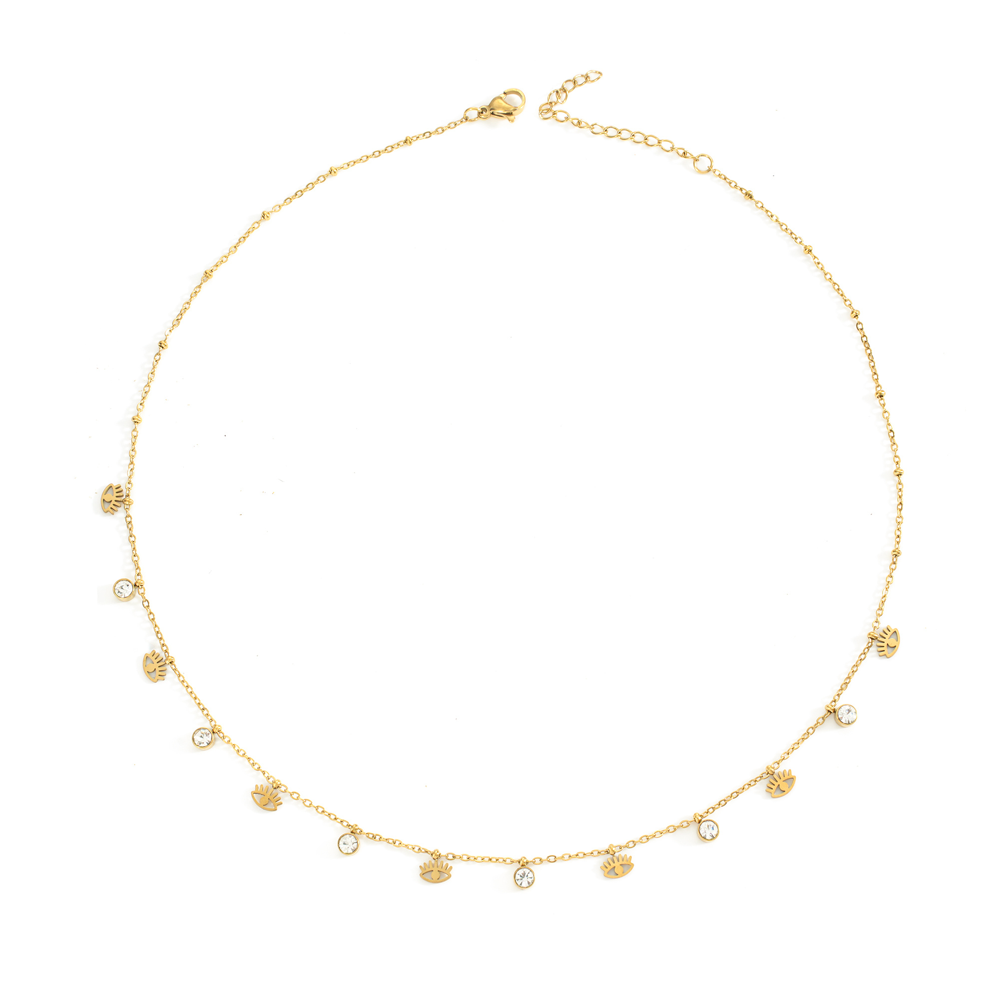 'I SEE' - korte halsketting met met crystal steentjes. De lengte van de halsketting is 40 cm plus een verlengstukje van 5 cm. Het materiaal van de ketting bestaat uit stainless steel met een echt gouden plating errond.