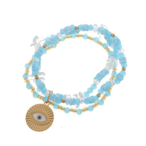 Protective Eye armband Blauwe trio-armband die bestaat uit 3 dunne armbandjes met kleine pareltjes en een Protective Eye amulet uit Stainless Steel en echt gouden plating , het amulet heeft een diameter van 1.7 cm